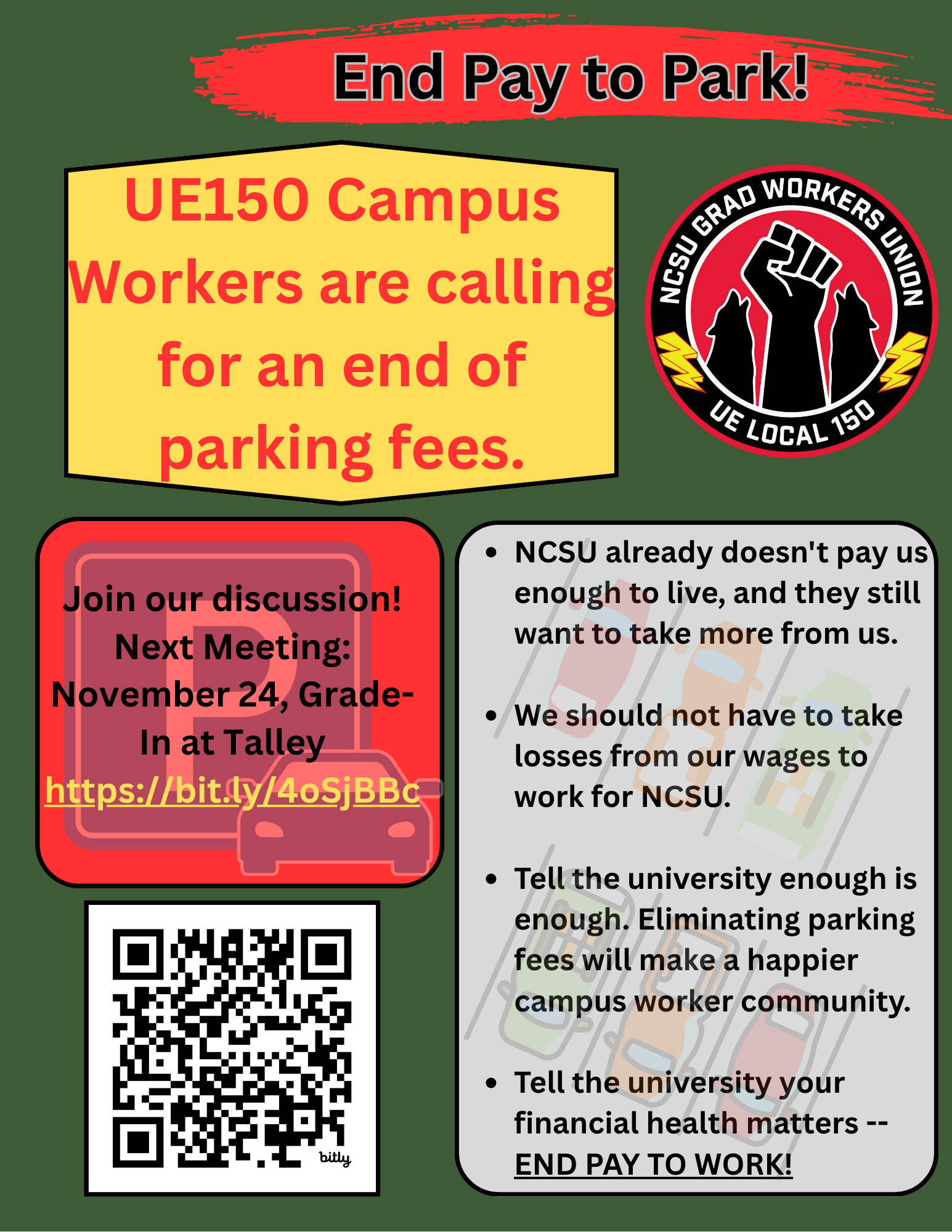 We had a great couple of weeks everyone and more to come! This Friday come support campus houseworkers at Bragaw Hall from 12-1. Sign our abolish parking fees petition, and start prepping to attend our grade-in/work-in on Nov 24th!